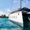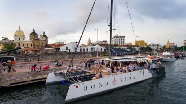 Salimos del muelle de la Bodeguita, frente a la ciudad Amurallada de Cartagena. Navegamos entre los rascacielos de Manga y Bocagrande. Posteriormente, navegamos entre Isla Manzanillo y Castillo Grande. Llegamos delante de El Laguito y la isla Tierra Bomba, donde la bahía se abre al mar. Aquí abrimos las velas y disfrutamos de la magnífica puesta de sol mientras navegamos silenciosamente a vela. Poco a poco las luces de los rascacielos van iluminándose.